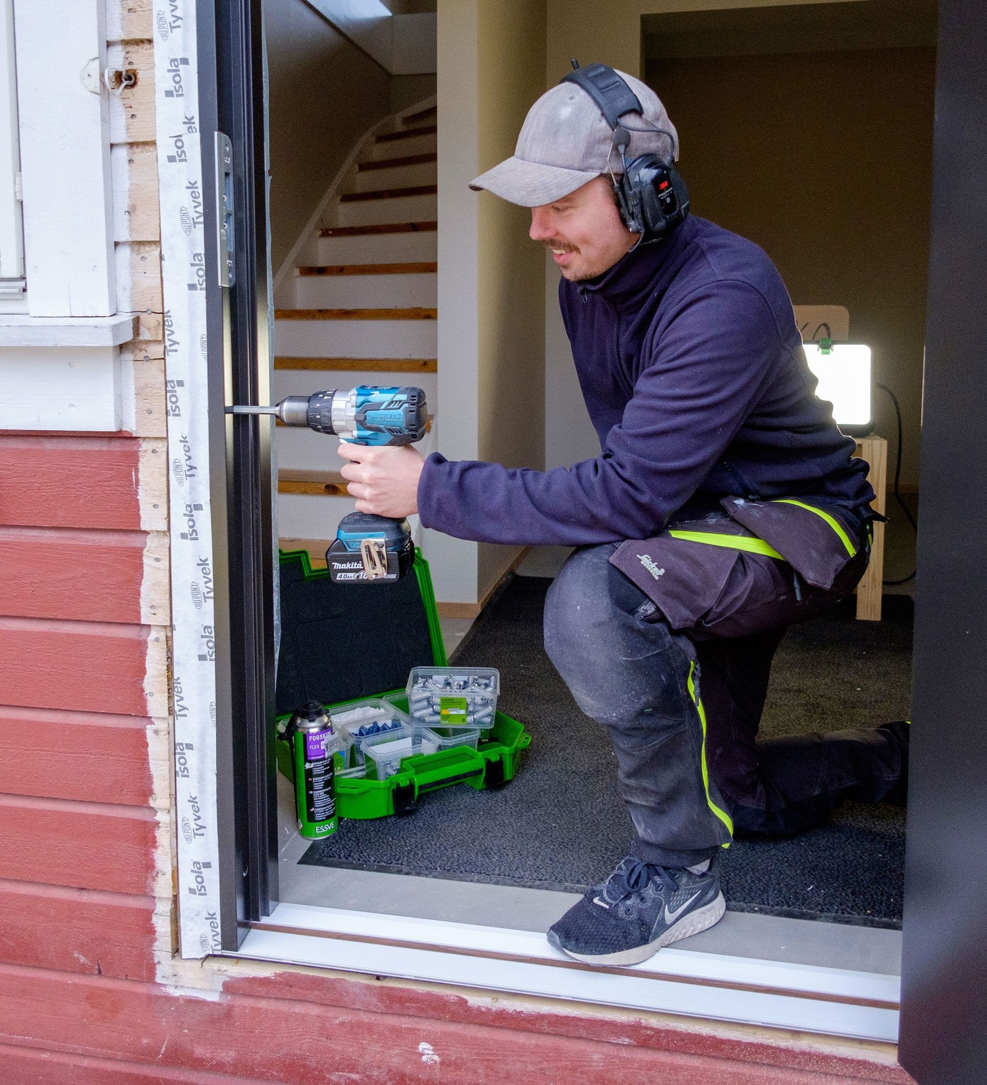 – Du må først bore et hull i karmen og så inn i materialet karmen skal festes i. Deretter setter du inn en plugg, og skrur deretter den valgte karmskruen inn i pluggen. Vær nøye med hvor du borer hullene, og pass på at karmen står der den skal stå når du monterer ferdig.