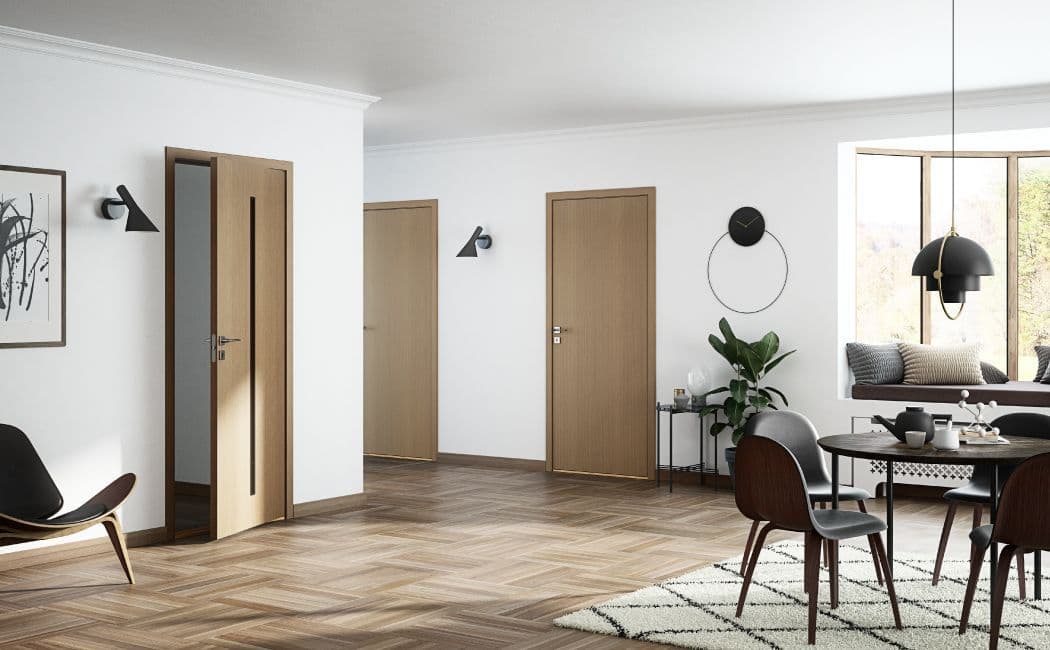 Valg av dør er også med på å virke støy i rommet. Velger du kompakte eller massive dører og i tillegg karm med dempelist reduserer du støynivået betraktelig. I tillegg unngår du slamringen som gjerne medfølger billige dører. Dempelist i karmen gir i tillegg økt følelse av kvalitet og en behagelig lyd når du lukker døra.